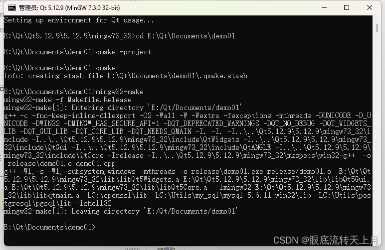 在命令行窗口执行mingw32-make命令,relese文件夹下会生成.exe可执行程序