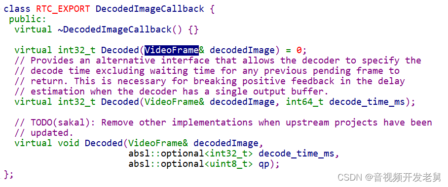 二是需要实现DecodedImageCallback回调基类来处理,解码后的数据回传到视频引擎。核心函数就是将编码后的数据转成原始视频帧VideoFrame结构回传到视频引擎。