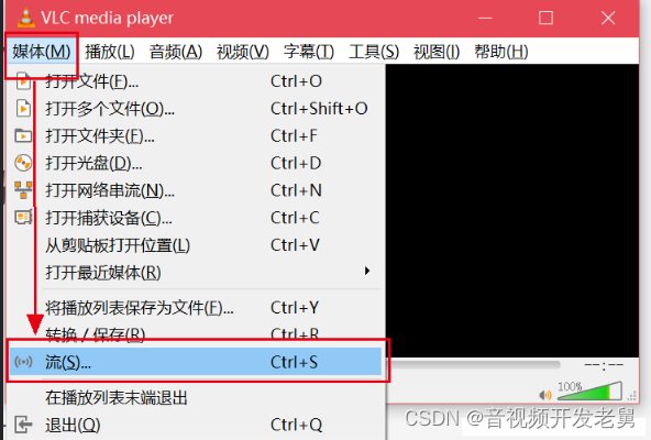 打开安装的VLC工具,选择顶部菜单 媒体 -> 流