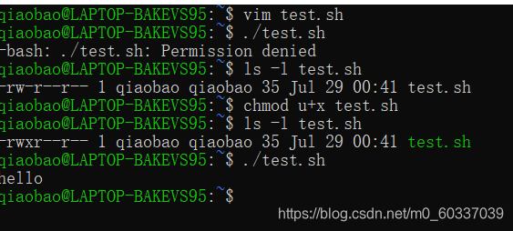 这里我们在命令提示符后用相对文件路径用执行shell脚本test,但是提示没有执行权限。通过chmod命令给文件所有者添加执行权限。执行结果在终端输出hello