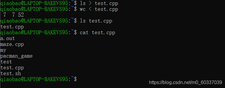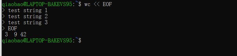 实例1:将test.sh文件中的内容重定向到wc命令中,其中wc命令的功能为对数据中的文本进行计数。默认情况会输出文本的行数、文本的词数、文本的字节数。