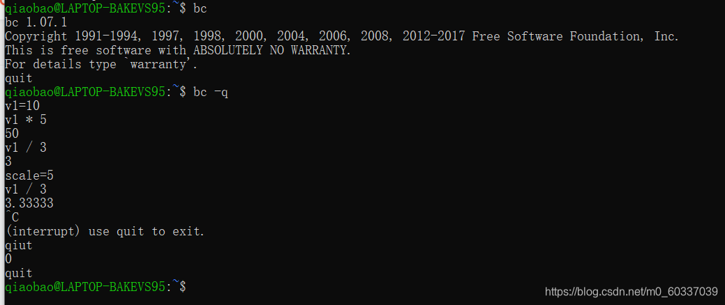 1、expr 命令只能处理整数运算,要想处理浮点数运算,可以使用shell内建的bash计算器 — bc