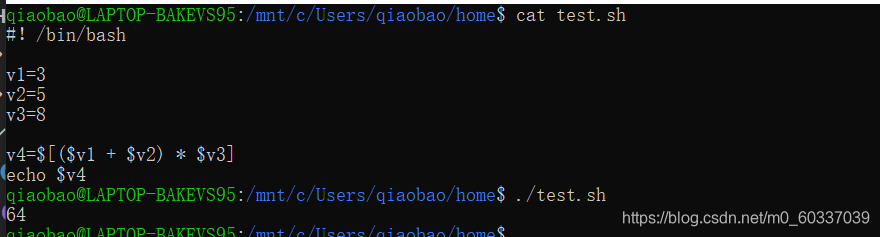 (2)当我们在脚本中需要获取的到expr命令的值时,需要用到命令替换,如 v1=$(expr 5 + 3)