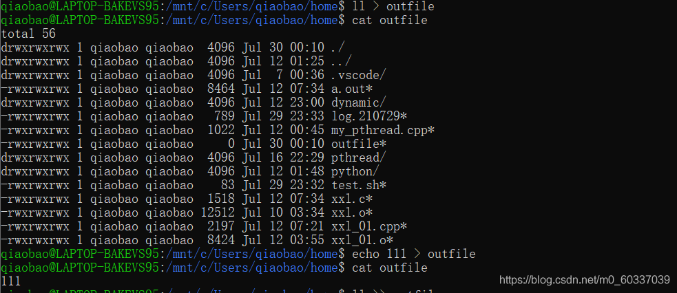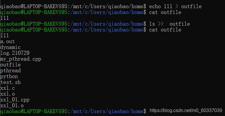 实例3:使用echo 命令将111输出到outfile文件中,将outfile文件覆盖。ls 命令的输出追加的到outfile文件中