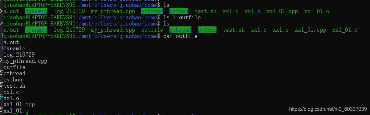 实例1: 将ls 命令的输出重定向到outfile文件中,当outfile文件不存在是会创建一个新的文件。当outfile文件存在时会覆盖原有文件(可以理解为删除了原来的outfile,然后创建了一个新的outfile文件)。