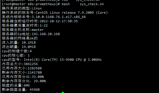 shell脚本巡检服务器硬件及网络流量问题 操作系统的类型:操作系统的版本号:系统内核版本号:服务器当前运行时间:服务器最后重启时间:服务器主机名称:服务器的ip地址:服务器的网络是ok的流入的量:流出额量:cpu的物理个数:cpu的核心数: cpu的型号: 内存总大小:已用内存大小:剩余内存大小:已用内存百分比:剩余内存百分比:磁盘的总量:剩余磁盘总量: