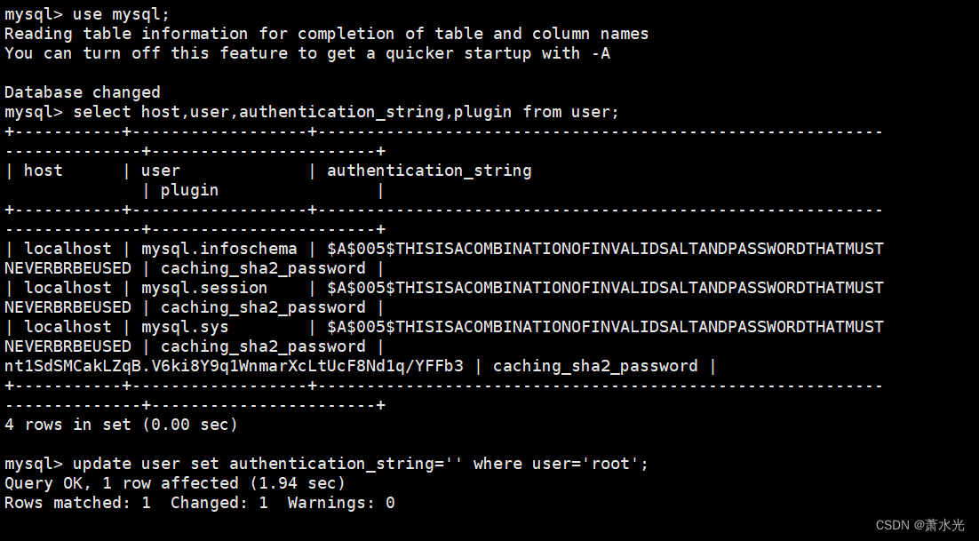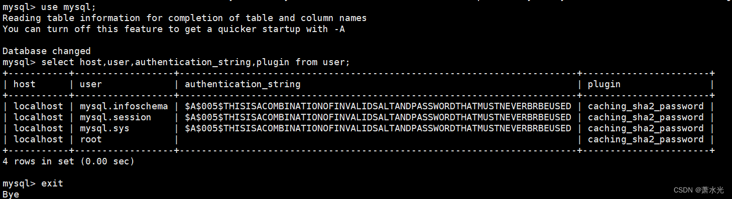 - 查看用户表 user mysql; select host,user,authentication_string,plugin from user;
