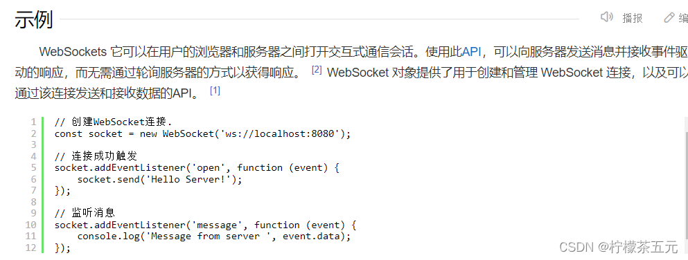 WebSocket是一种在单个TCP连接上进行全双工通信的协议。WebSocket通信协议于2011年被IETF定为标准RFC 6455,并由RFC7936补充规范。WebSocket API也被W3C定为标准。