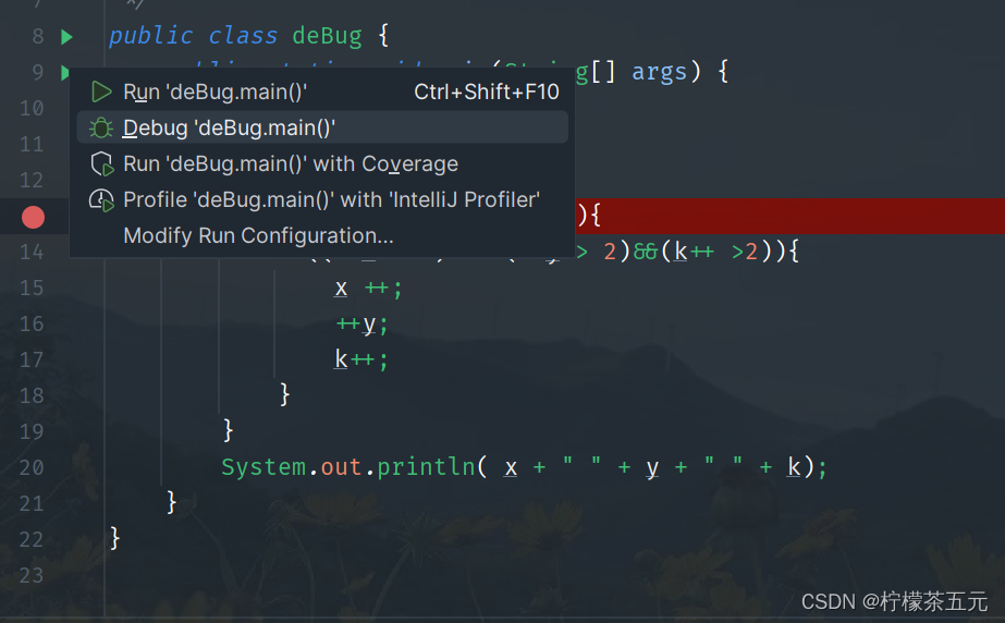 2.点击绿色三角箭头,点击绿色甲壳虫“deBug.main()”