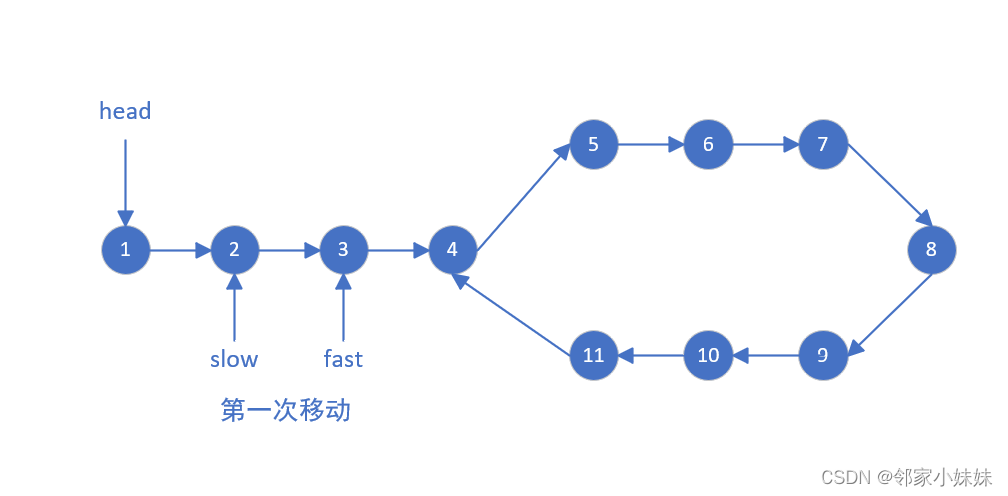 检测单链表环并返回环节点 该算法又称为龟兔快慢指针算法,即创建两个指针,fast和slow指针,slow每次走一步,fast指针每次走两步,当他们相遇了则存在环,反之fast指针到了尾部则无环。当相遇的时候,slow指针回到头结点位置,fast指针不动。开始第二次循环,fast和slow都每次走一步,当两个节点相遇时的节点即为环节点位置。