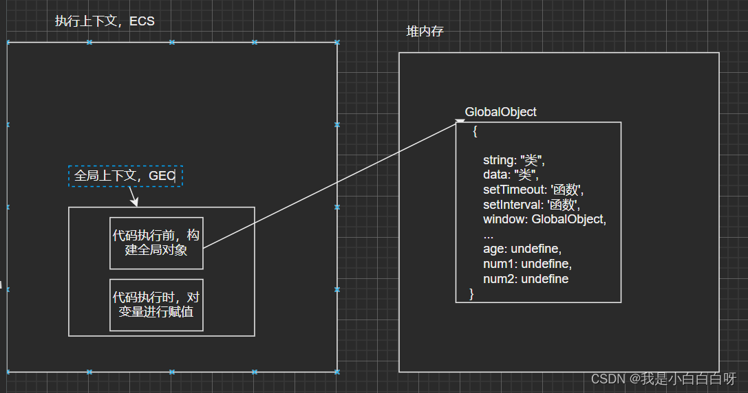 js代码执行过程 V8解析(parse)上述代码会在堆里面产生GlobalObject(全局对象)V8解析(parse)上述代码会在堆里面产生GlobalObject(全局对象)GEC构建活动对象(AO, activation object)GEC构建FEC(函数执行上下文),这里age1=18。GlobalObject也是在GEC中构建的。),在GEC对变量进行赋值以及执行函数。给age赋值为18(此时VO->GO)执行函数foo(18))中构建全局上下文(这里foo是一个地址。