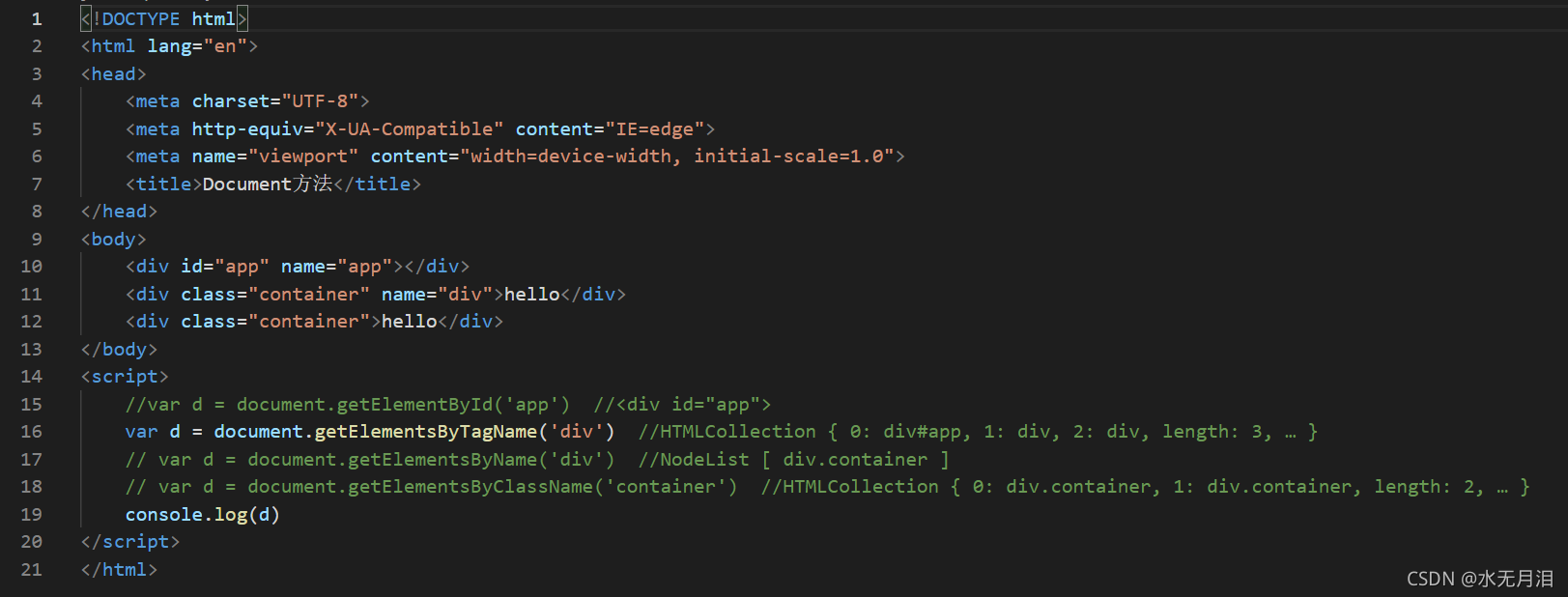 getElementsByTagName() 参数为要取得元素的标签名,返回包含另个或者多个元素的NodeList,在HTML文档中该方法返回的是HTMLCollection对象,与NodeList非常类似。可以通过[index/name],item(),namedItem(name)访问