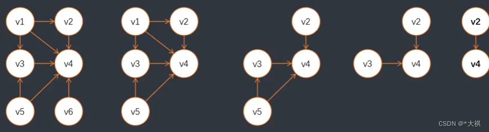 只要每次去找入度为0的点(符合执行条件),取出它作为答案并将其删除,同时删除它到其它顶点的边,再重复此过程,直到顶点全部删完或是没有办法删除结点了(存在环,无解)