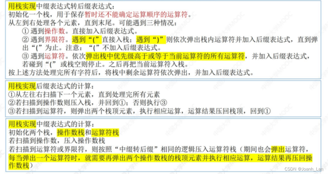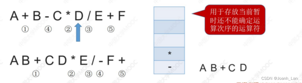 ②遇到界限符\color{red}界限符界限符。遇到“(”直接入栈;遇到“)”则依次弹出栈内运算符并加入后缀表达式,直到弹出“(”为止。注意:“(”不加入后缀表达式。