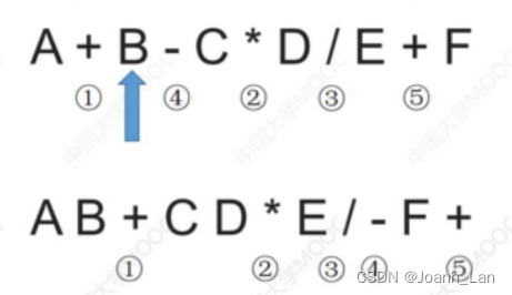 ③遇到运算符\color{red}运算符运算符。依次弹出栈中优先级高于或等于当前运算符的所有运算符,并加入后缀表达式,若碰到“(”或栈空则停止。之后再把当前运算符入栈。