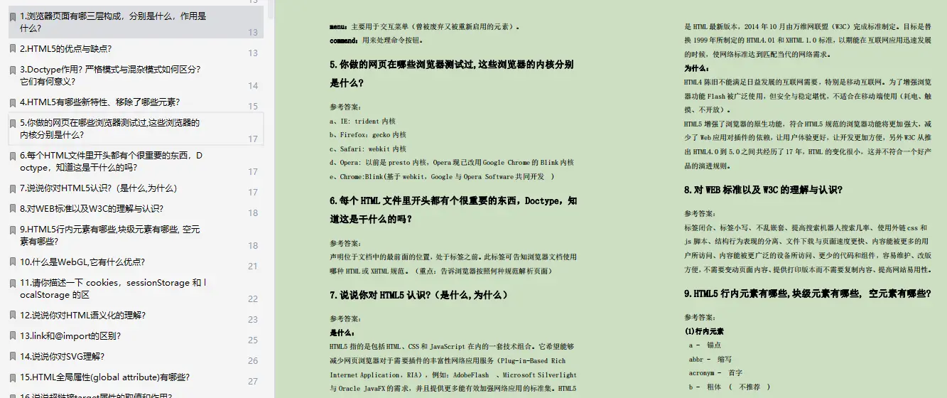 HTML是页面中内容的载体,可以展示开发者想要用户浏览的任何文字、图片、音频信息。对于HTML的各类标签,不仅要掌握日常开发中经常碰到的,也要慢慢积累那些不常用标签,块级、行内元素的定义以及二者相互转换几乎是每场技术一面常考问题。