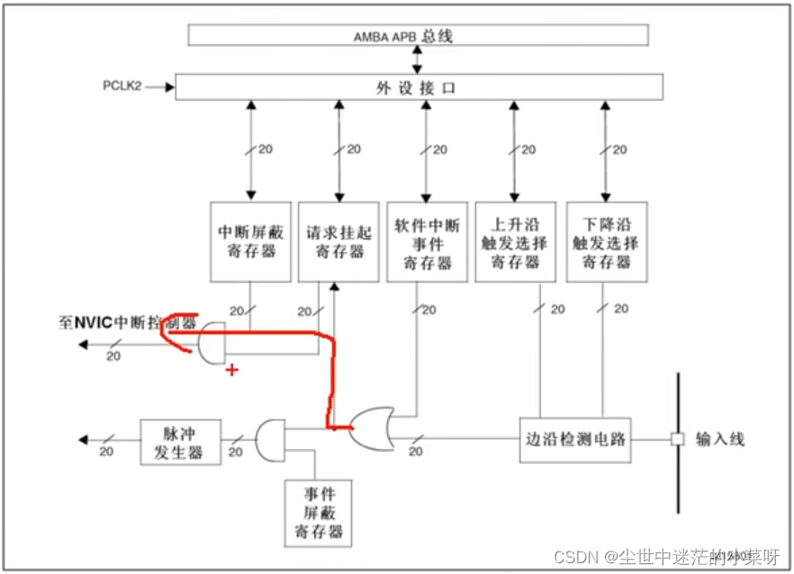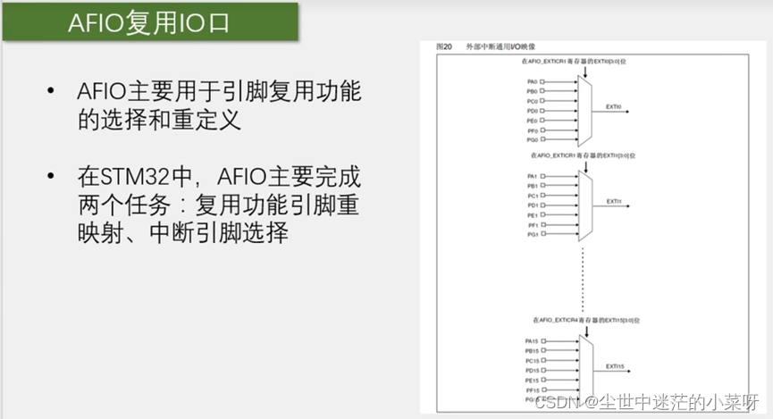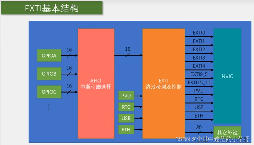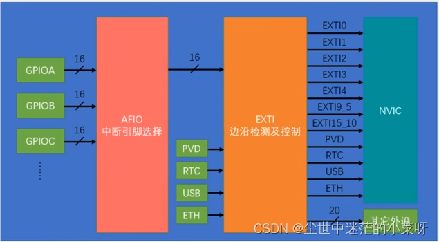 AFIO:中断引脚选择器,因为GPIO_Pin只有16个中断通道,所以同一个Pin,只有一个能接到通道内,例如PinA0 PinB0 PinC0 只有一个可以接到通道0上。