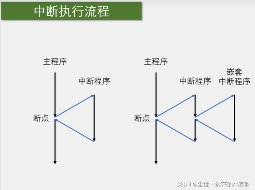 中断响应:中断触发,主程序优先处理中断程序,中断程序结束后回到主程序保护点继续执行主程序。