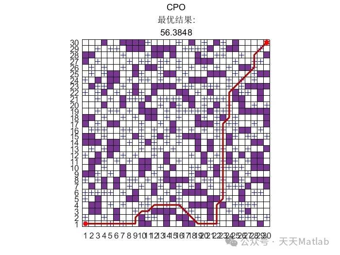 为了验证CPO算法在栅格地图路径规划中的有效性,我们进行了仿真实验。实验环境采用随机生成的栅格地图,地图大小为 100x100,障碍物比例为 30%。起始点和目标点随机选取。我们将CPO算法与A*算法进行比较,比较指标为路径长度和计算时间。