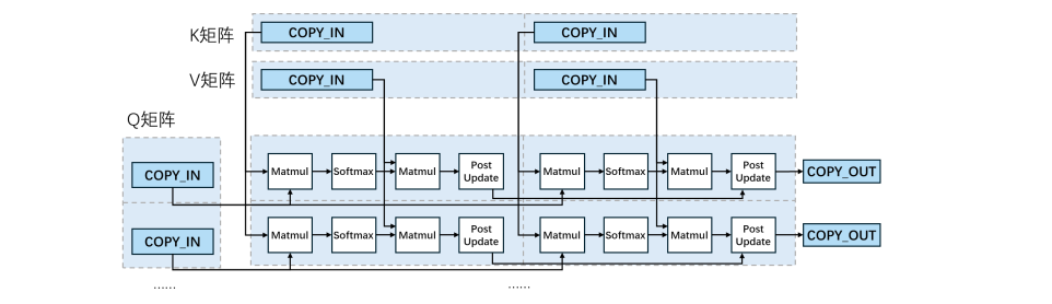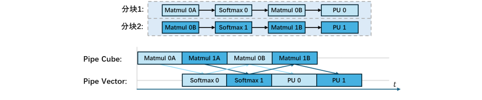 分块内部计算结构更为复杂:FA中的每个分块计算包含四个部分:Matmul、Softmax、Matmul和PostUpdate,每个部分均为一个结构较为复杂的子计算图(图中未展示细节)。其中,Matmul部分主要依靠Cube计算单元完成,而Softmax和 PostUpdate部分则主要依赖Vector计算单元实现。