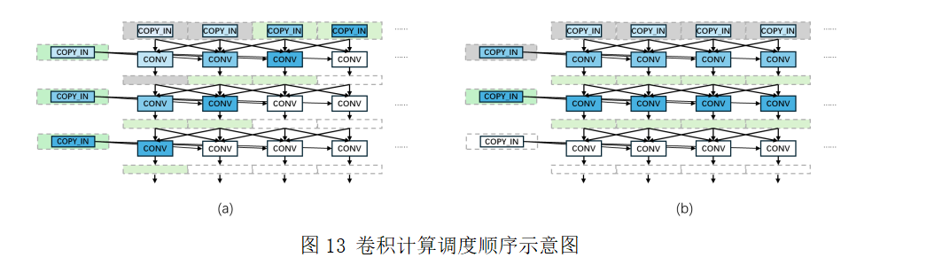 卷积计算图在层间呈现交错的依赖结构,因此调度顺序对缓存驻留影响显著。通常可采用深度优先与广度优先两种调度策略,分别适用于不同场景。如图13所示,(a)和(b)分别表示深度优先和广度优先策略,图中通过节点颜色深浅表示调度顺序先后。
