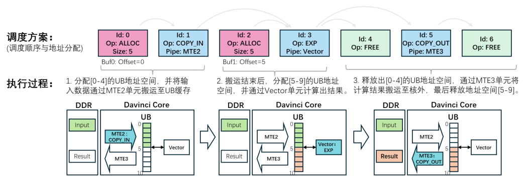 这样就得到了一个包括节点调度顺序和缓存地址分配在内的完整调度方案,其在实际硬件上的执行过程如图2所示。