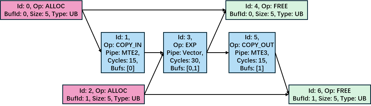 最后,ALLOC节点发出的有向边通常指向对应缓冲区数据的生产者(例如,Id为0的ALLOC节点指向COPY_IN节点);而该缓冲区内数据的消费者则通过有向边指向FREE节点(例如,EXP节点指向Id为4的FREE节点);生产者和消费者之间也通过有向边相连。
