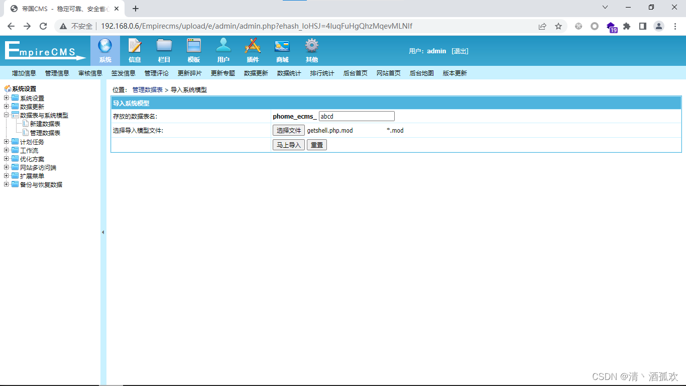 本地准备一个1.php并改名为1.php.mod,注意这里需要用\$进行转义,存放的数据表名需要填一个数据库内没有的表名,比如abcd,点击上传
