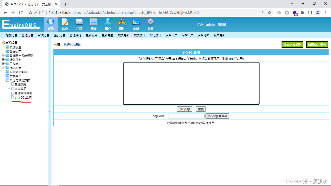 EmpireCMS 7.5版本及之前版本在后台备份数据库时,未对数据库表名做验证,通过修改数据库表名可以实现任意代码执行。