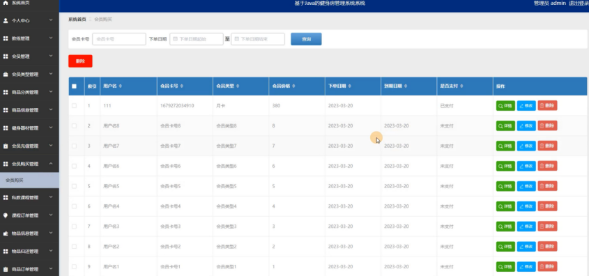 管理员点击会员购买管理:在会员购买管理页面,可以对用户名、会员卡号、会员类型、会员价格、下单日期、到期日期、是否支付等信息,进行查询或者删除会员购买等操作,如图5-13所示: