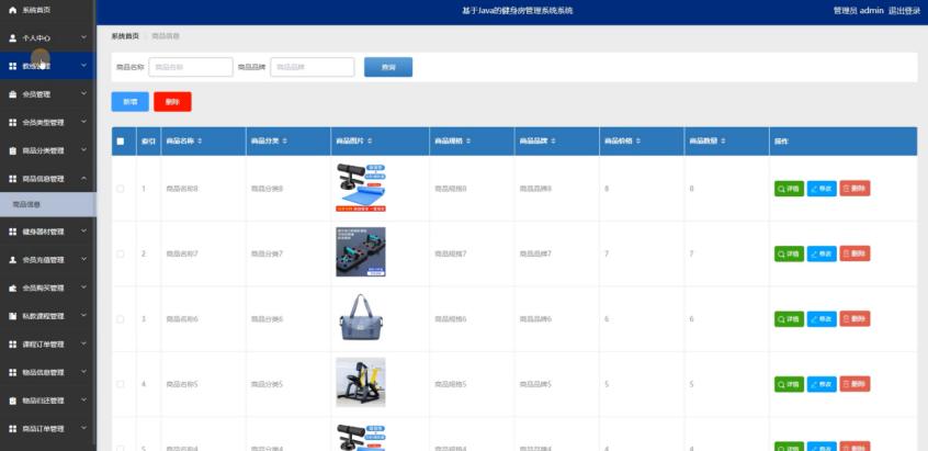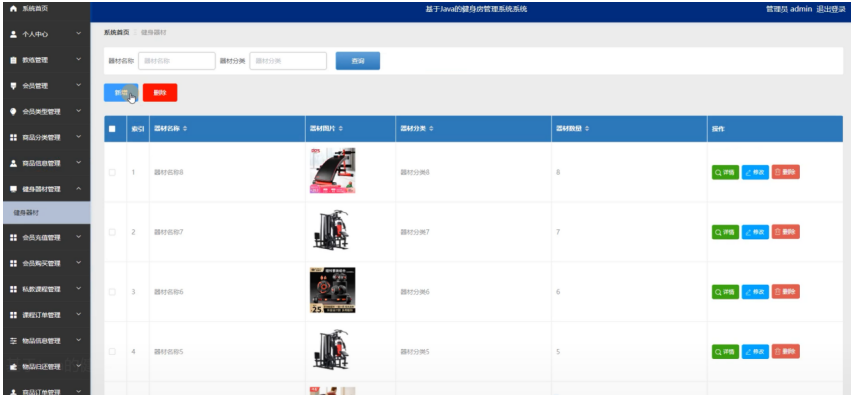 管理员点击健身器材管理:在健身器材管理页面,可以对器材名称、器材图片、器材分类、器材数量等信息,进行查询、新增或者删除健身器材等操作,如图5-12所示: