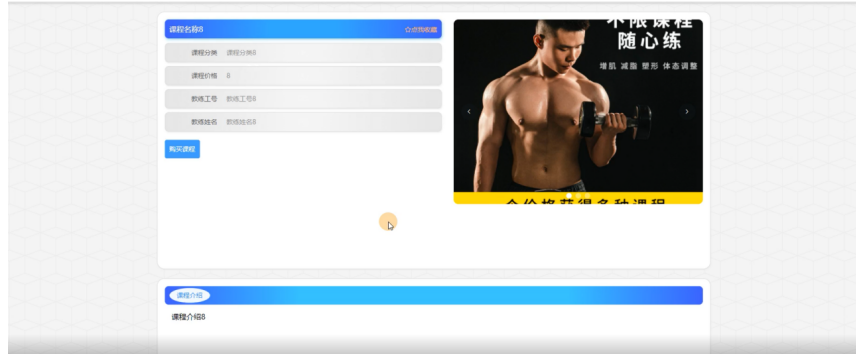 会员点击私教课程页面的搜索栏输入课程名称、课程分类、教练姓名进行查询,然后可以查看课程名称、课程分类、课程图片、课程价格、教练工号、教练姓名等信息,如果有需要可以进行购买课程或收藏等操作,如图5-5所示:
