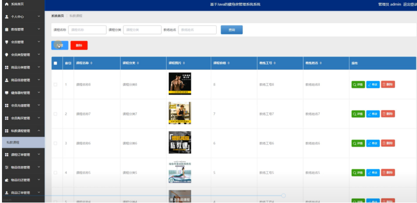 管理员点私教课程管理:在私教课程管理页面,可以对课程名称、课程分类、课程图片、课程价格、教练工号、教练姓名等信息,进行查询、新增或者删除私教课程等操作,如图5-14所示: