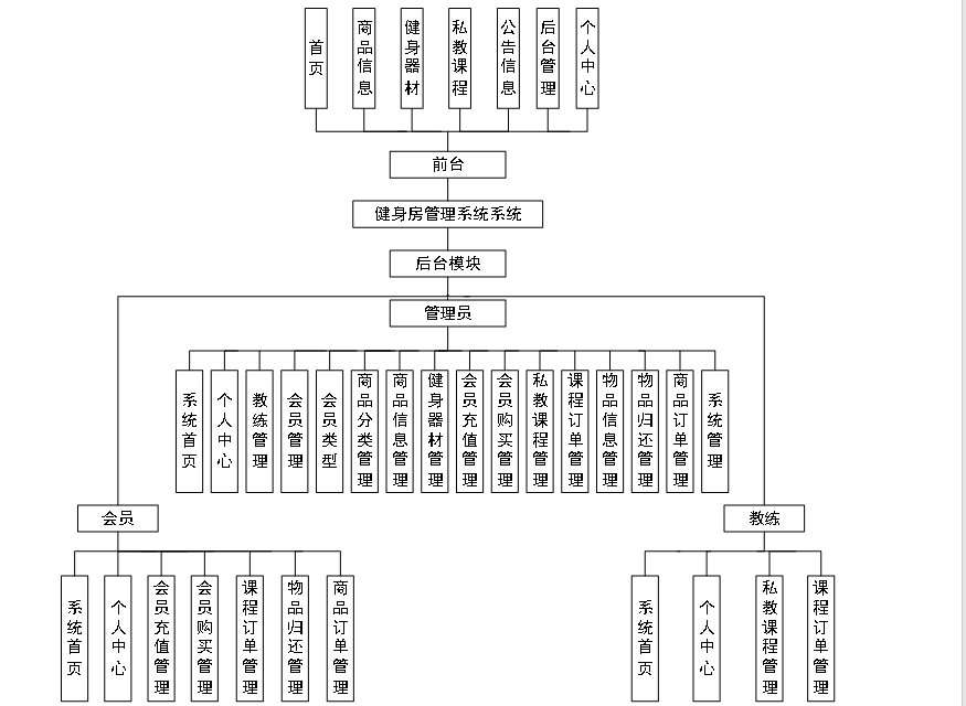 系统功能结构图是系统设计阶段,系统功能结构图只是这个阶段一个基础,整个系统的架构决定了系统的整体模式,是系统的根据。健身房管理系统的整个设计结构如图4-1所示。