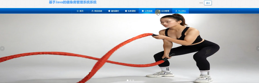 当游客打开系统的网址后,首先看到的就是首页界面。在这里,游客能够看到健身房管理系统的导航条显示首页、商品信息、健身器材、私教课程、公告信息、后台管理、个人中心等。系统首页界面如图5-1所示:
