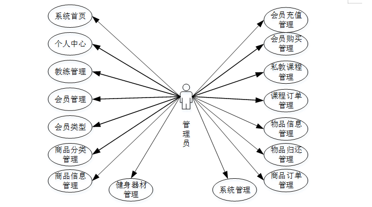用例图,即以用户视角来描述本健身房管理系统的功能,前面已经分析了本健身房管理系统的总体设计,讨论了各个方面的需求。下面,将以管理员、会员和教练为例。