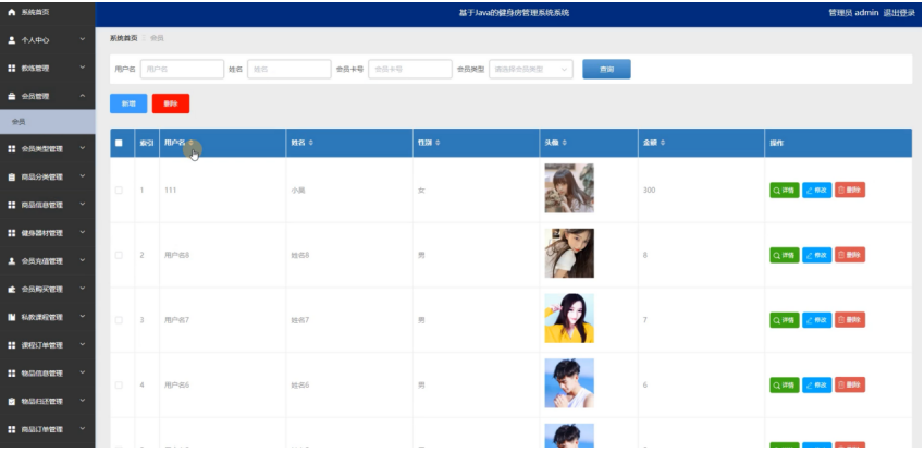 管理员点击会员管理:在会员管理页面,可以对用户名、姓名、性别、头像、金额等信息,进行查询或者新增、删除会员信息等操作,如图5-10所示: