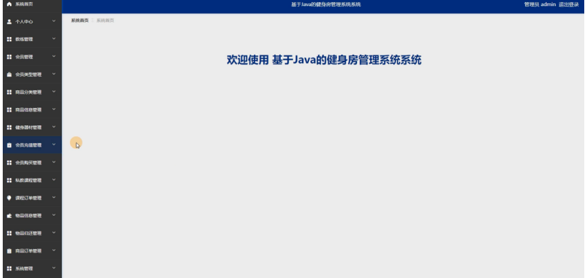 管理员进入系统主页面,主要功能包括对系统首页、个人中心、教练管理、会员管理、会员类型、商品分类管理、商品信息管理、健身器材管理、会员充值管理、会员购买管理、私教课程管理、课程订单管理、物品信息管理、物品归还管理、商品订单管理、系统管理等进行操作。管理员主页面如图5-8所示: