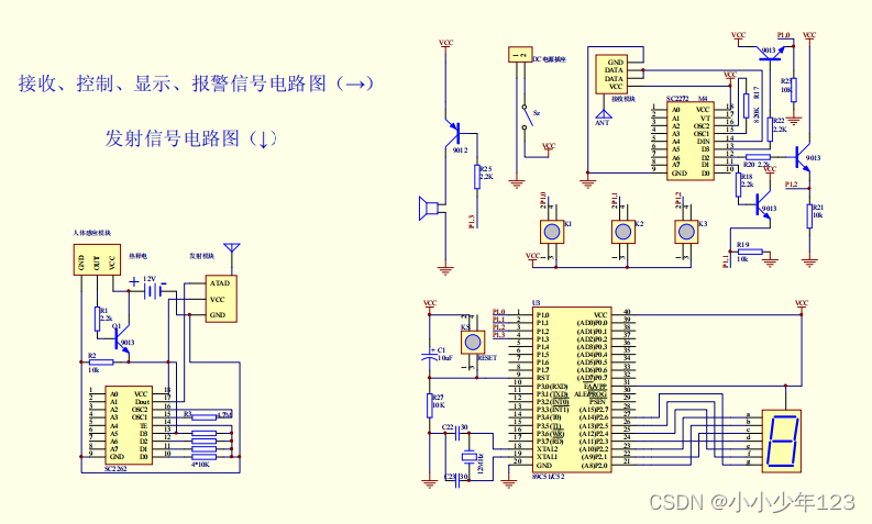- 主机有三个控制按键,一个按键布防,一个按键是遇到紧急情况紧急报警(或是测试键),一个是撤防。另一个为单片机的上电复位按键。