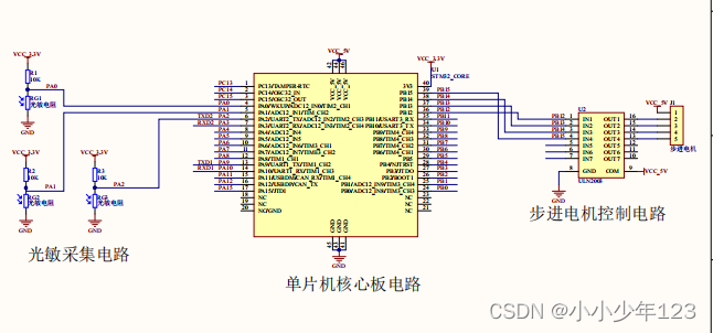 本设计采用光电跟踪的方法,利用步进电机驱动,由光电传感器根据入射光线的强弱变化产生反馈信号到微机处理器。微机处理器运行程序,通过对跟踪机构进行控制,调整太阳能电池板的角度实现对太阳的跟踪。整体电路主要由STM32单片机、2路光敏电阻、步进电机控制及电源组成;原理图如图: