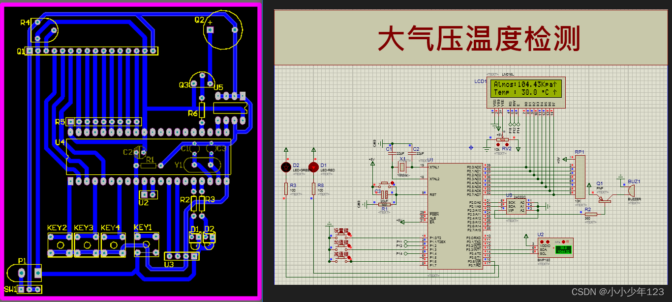 - 本设计采用LCD1602显示屏实时显示信息,BMP180作为大气压温度传感器。