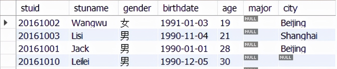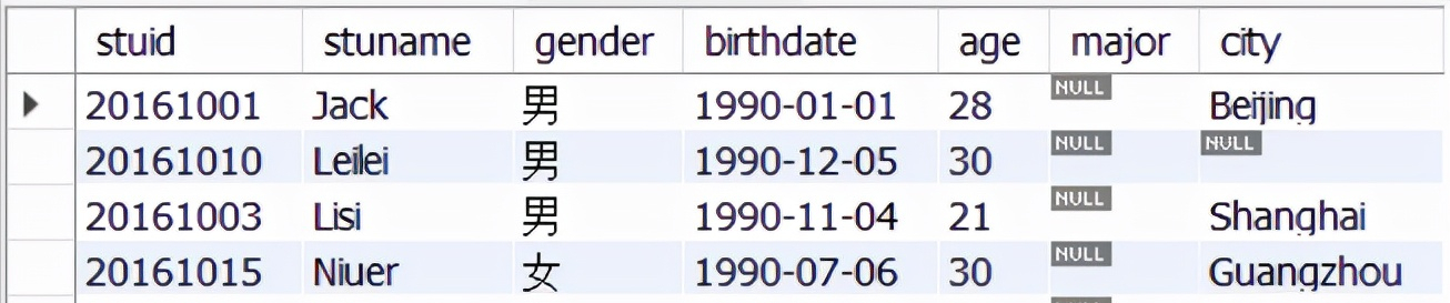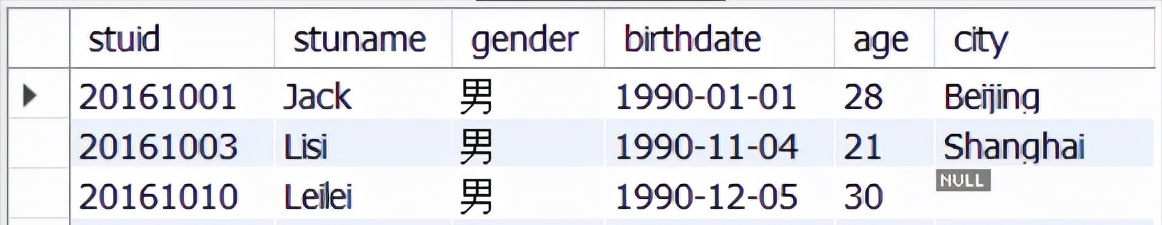反过来,如果查询城市不为空的记录,跟上is not null即可,sql语句为: