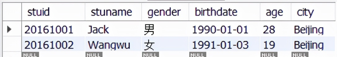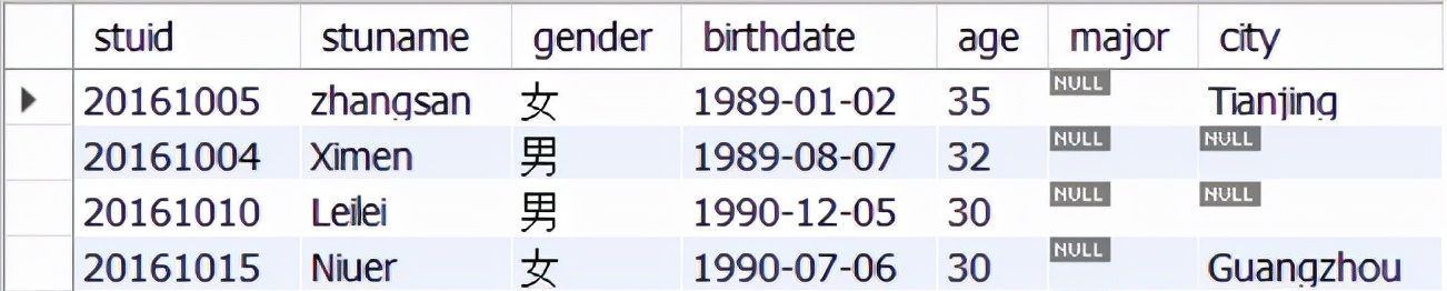 例如,在表stuinfo中,查找城市中含有字符串‘an’的记录,sql语句为: