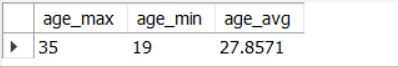 select max(age) as age_max,min(age) as age_min,avg(age) as age_avg from stuinfo;