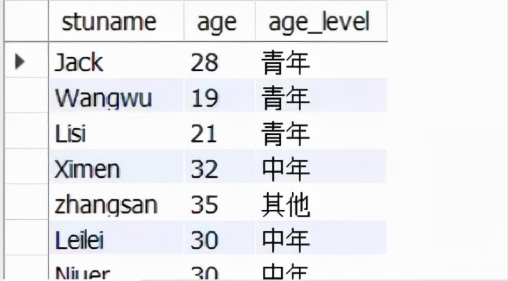 select stuname,age, case when age<30 then '青年' when age>=30 and age<35 then '中年' else '其他' end as age_level from stuinfo;