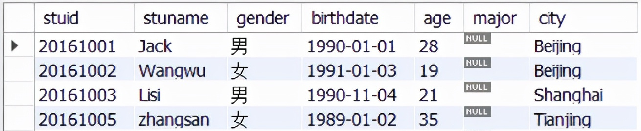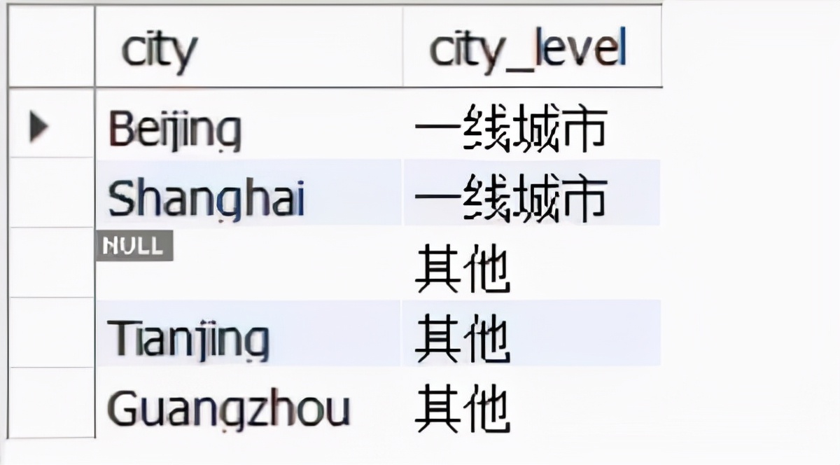select distinct city, case city when 'Beijing' then '一线城市' when 'Shanghai' then '一线城市' else '其他' end as city_level from stuinfo;