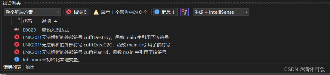 cuda的GPU编程显示无法解析外部符号cufftDestroy,cufftExecC2C,cufftPlan1d 问题描述:,在学习cuda的FFT时,已经引用了<cufft.h>还是报如下图所示错误。项目--属性--输入,在附加依赖项中填入cufft.lib。设置完之后再运行就没问题了。