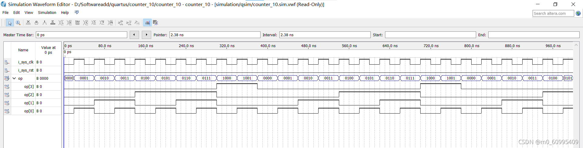 vhdl写模十计数器(可任意选择) 新手(我)编写模十计数器的过程一、实体部分,确定输入输出变量输入变量一定有一个时钟信号,i_sys_clk系统复位输入:i_sys_rst 以及系统的输出变量output,模十应该是以四位向量的格式输出,故设置变量为逻辑位矢量类型std_logic_vector(3 downto 0)二、编写结构体部分 重点是:首先需要设置一个信号变量,用于结构的全局部分,以此来计数,因为output只能用于输出,不能在程序中进行赋值或者计算。 判断i_...