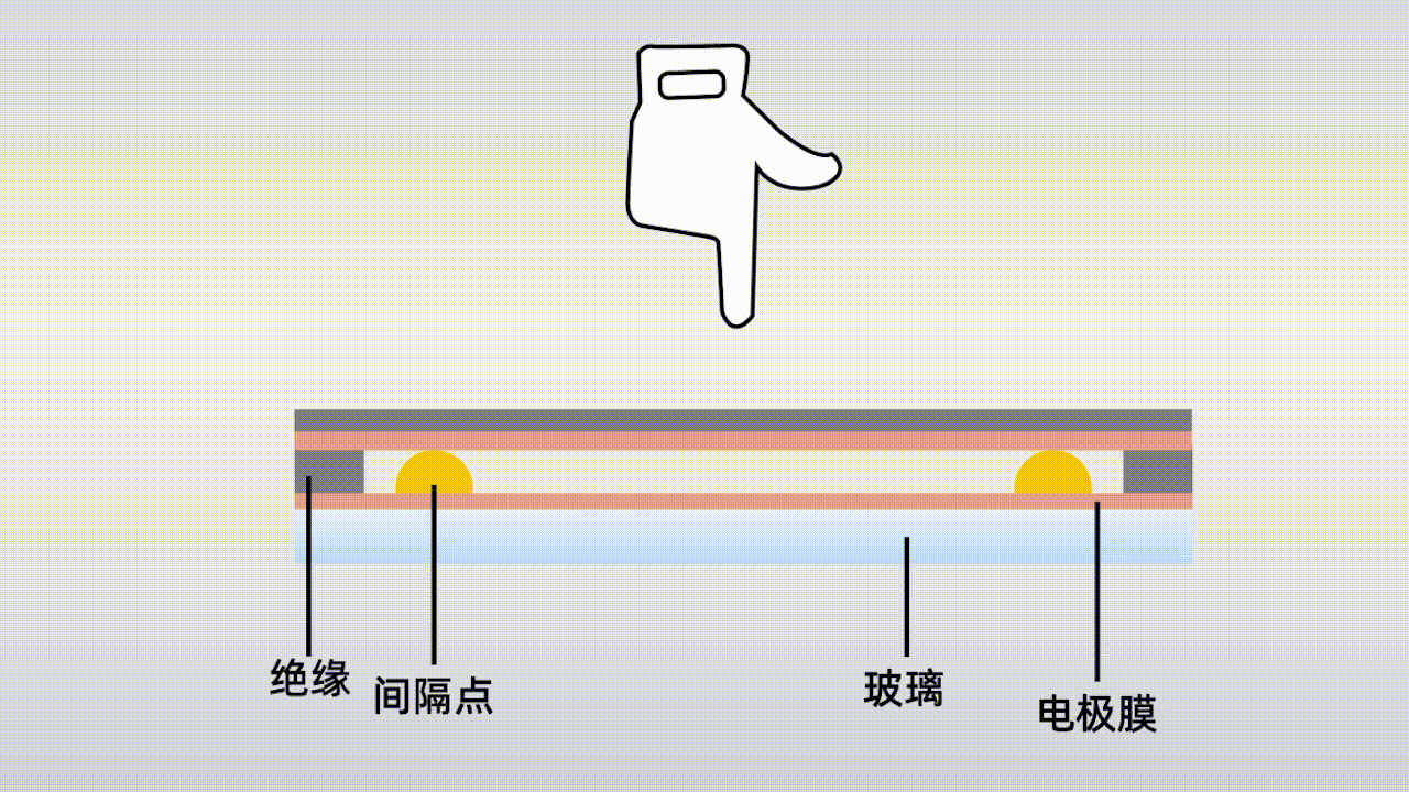 电阻式触摸的原理和电容式不同。它是在两个电极膜之间形成一定的绝缘空腔。当手指或者其他物品比如钥匙对表面薄膜接触并施加一定压力的时候,使得表面电极膜弯曲,和下面的电极膜接触,从而产生电流被检测到。