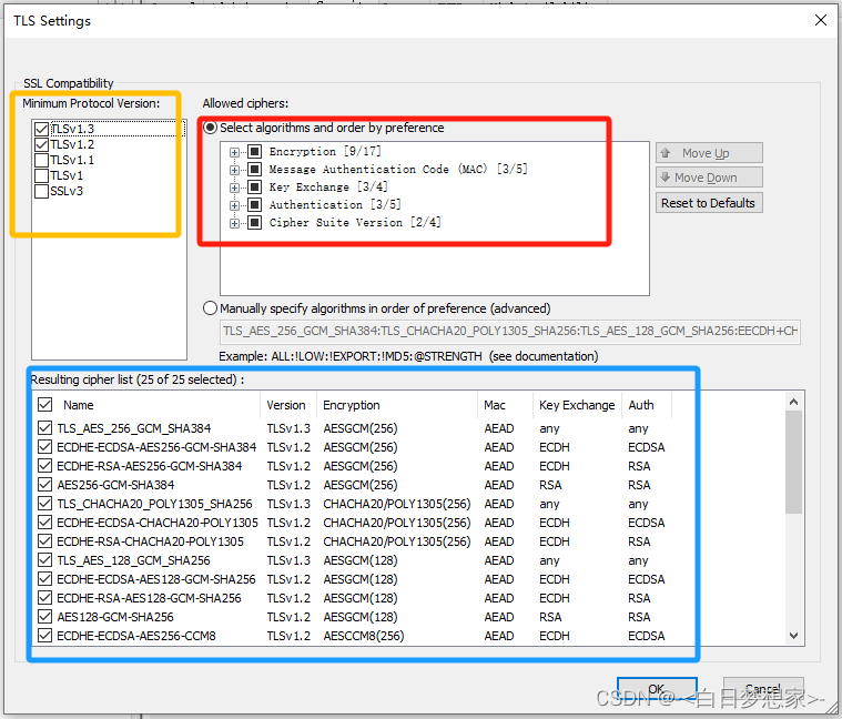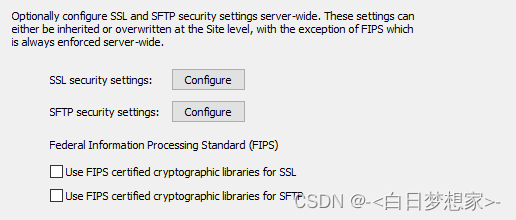 在这个安全界面下,提供了两种安全认证方式,一种是ssl安全认证,另一种是sftp安全认证,我们进行旗下的configure选项,查看各自支持的协议和版本选项。